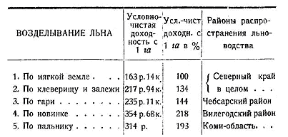 В среднем на одно крестьянское хозяйство приходится всего лишь 2,96 га пашни. Столь малая обеспеченность пашней, конечно, решительно препятствует быстрому переходу льна с подсеки в поле.