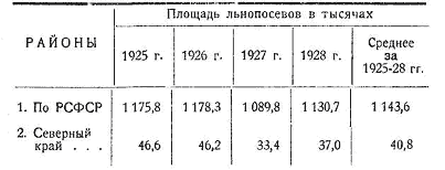 Из приведенной таблицы видно, что удельный вес северного льна по отношению к площади льна по всей РСФСР за период с 1925 по 1928 годы снизился с 3,9 до 3,3 проц. За 1929/30 год произошло дальнейшее снижение.