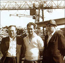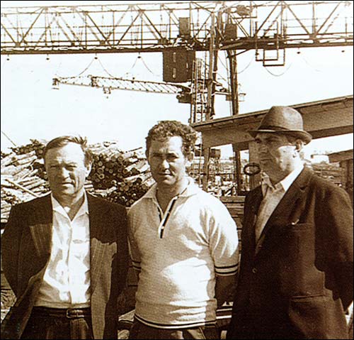 Судская лесобаза. Слева направо: генеральный директор объединения «Череповецлес» А.И. Погодин, начальник Вологодского ПКТБ Я.Г. Фрейдин, начальник Судской лесобазы Г.Р. Гурко