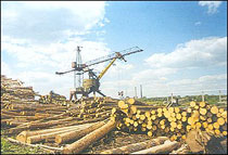 Биржа сырья. Разгрузка круглого леса портальным краном
