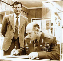 1985 г. «Прогресс». Космонавт А.А. Леонов расписывается в книге посещений почетных гостей. Слева - А. С. Степанец, заведующий лесным отделом обкома КПСС
