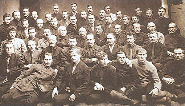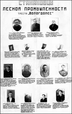 кадров, обусловленная тяжелыми условиями труда. Дневная выработка по валке леса на человеко-день колебалась от 2 до 2,5 кубометра, а по конной вывозке - 1,5-2 кубометра. Отдельные же передовики производства добивались поразительных результатов. Так, участник областного слета стахановцев-тысячников рабочий Озерского лесопункта Нюксенского леспромхоза Балагуров (во втором ряду третий слева) вырубил за 1936 год 2583 кубометра и на 1 октября 1937 года - 3258 кубометров. В отдельные месяцы, например, в июле он установил рекордную выработку в среднем 41 кубометр в день, а 17 июля свалил 507 деревьев общим объемом 78,3 кубометра.