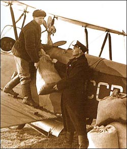 Погрузка на самолет лесных семян для аэропосева. Устюженский лесхоз, 40-е годы.