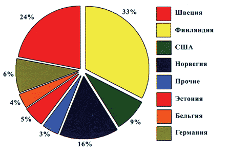 Одной из основных форм взаимодействия вологодской лесной отрасли с мировым ЛПК является экспорт лесопродукции. Правда, характер экспорта пока имеет сырьевую направленность. Главным конкурентоспособным материалом долгое время являлся необработанный круглый лес (хвойный пиловочник, березовые балансы), доля которого в валютной выручке имела устойчивую тенденцию к росту. Сегодня состав экспортной продукции несколько изменился. В 2002 году древесины и изделий из нее было экспортировано на сумму около 120 млн. долларов США. Причем львиную долю экспорта составили пиломатериалы (около 250 тысяч кубометров), фанера (около 60 тысяч кубометров) и древесные отходы (около 34 тысяч тонн).