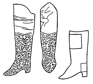 Весьма любопытна история валяной русской обуви. Как известно, меховая обувь была распространена только на севере. В центральных районах для зимы делали мягкую войлочную обувь или низкую валяную без голенищ. Она имела разные названия — коты, чуни, кеньги — и в любом случае не закрывала голенищ. Вместо галош к ней употреблялись в народном быту лыковые ступни. Собственно валенки — высокие зимние валяные сапоги — стали делать гораздо позже. Валенки были белого, серого, коричневого и черного цветов. Валенки светлых тонов иногда отделывали красным орнаментом, фигурными стежками, нашивками, ремешками и аппликациями. Серые валенки были обувью крестьян, а в черных ходили только очень богатые люди. С пренебрежением знать относилась к тем, кто ходил в лаптях, — так и называли их «лапотниками» и не догадывались о том, что через три века их потомки будут носить народную обувь — валенки с галошами.
