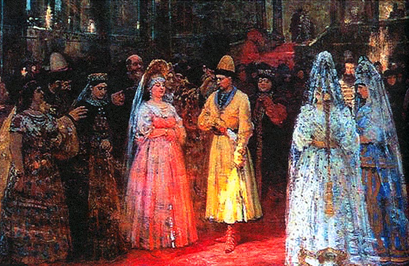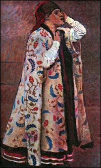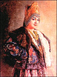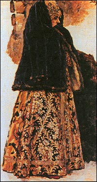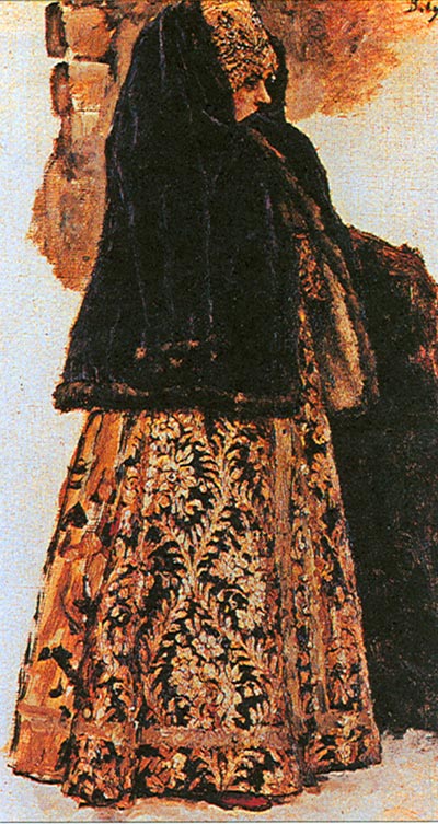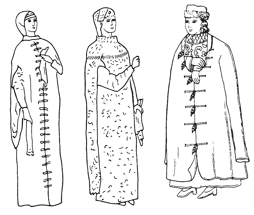 Если летник в женском одеянии соответствовал зипуну в мужском, то опашень и телогрея соответствовали кафтану. В документах встречаются также названия женских охабней, однорядок и ферязей, но часто все эти накидные верхние одежды в женском гардеробе называли шубами. Шуба у женщин означала вообще верхнюю накидную одежду. Их делали из меха соболя, куницы, лисицы, горностая, зайца, белки, смотря по состоянию. Покрывали шубы сукном и шелковыми материями — объярью, камкою, атласом, тафтой червчатого, желтого, зеленого и белого цветов. Белый цвет преобладал в женских шубах в XVI в., а в XVII в. стало модным покрывать их цветными шелками с золотым узором. Спереди сверху донизу на шубах был разрез, он застегивался пуговицами и окаймлялся металлическим кружевом, кованым или плетеным, либо шелковым, расшитым золотом. Вдоль разреза по обеим сторонам делались нашивки с золотой вышивкой и кистями, а по шее к шубе пристегивалось ожерелье из другого меха. Если шуба была беличья или лисья, то ожерелье к ней делали бобровое. Рукава по краям украшали кружевом, которое снималось, хранилось отдельно и передавалось как фамильные драгоценности по наследству. Женские шубы были распашными с разрезом спереди и нераспашные, которые надевали или «накладывали» через головы.