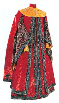 Другой вид женской верхней одежды — телогрея. Она была длиной до пят, уже в плечах и шире в подоле. Рукава телогреи были длинными, с проймами под мышками, как и в опашне, к краям рукавов пристегивалось запястье из другой материи, обыкновенно вышитое. Подол имел подпушку в виде широкой полосы другой материи, а разрез окаймлялся металлической тесьмой или шелковым кружевом, густо расшитыми золотом или тесемками с кистями. Обычно разрез телогреи застегивался 15—16 рядами пуговиц. Изготавливали эту одежду из сукна, камки, объяри, тафты и других тяжелых шелковых тканей. Подкладкой обычно служила тафта. Зимние телогреи сверху донизу шили на куньем, лисьем или собольем меху.
