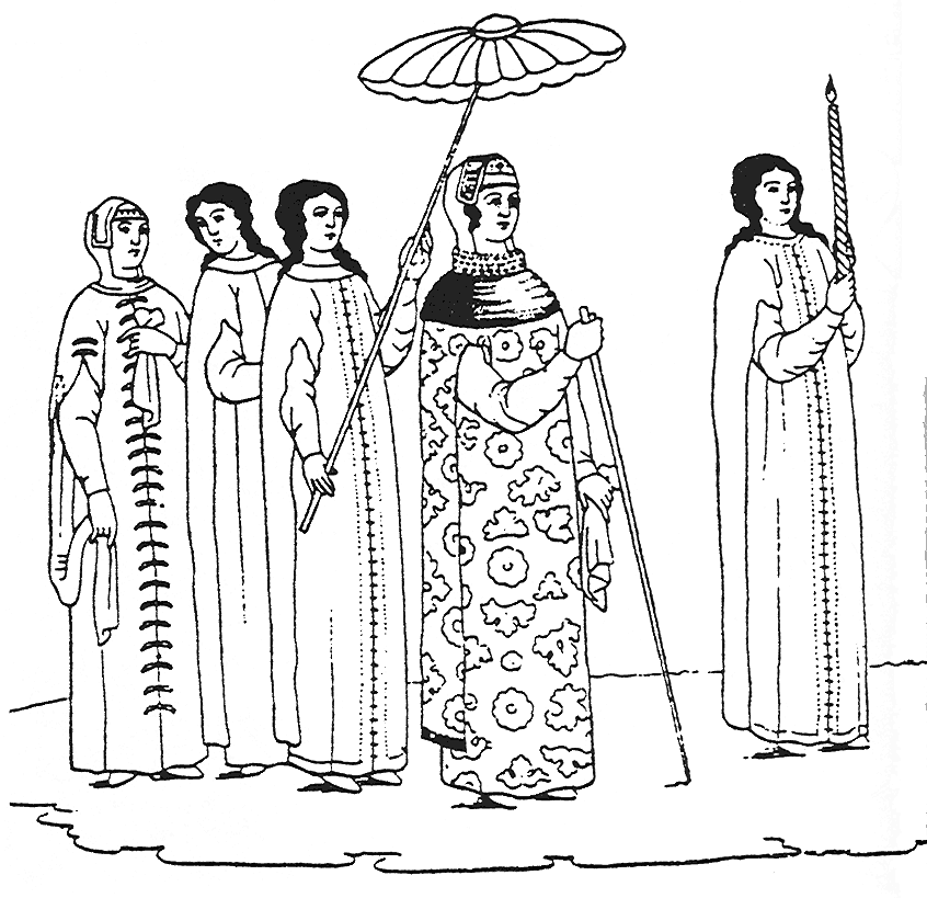 Женская одежда: телогрея, накладная шубка, опашень. Рисунки XVII в.