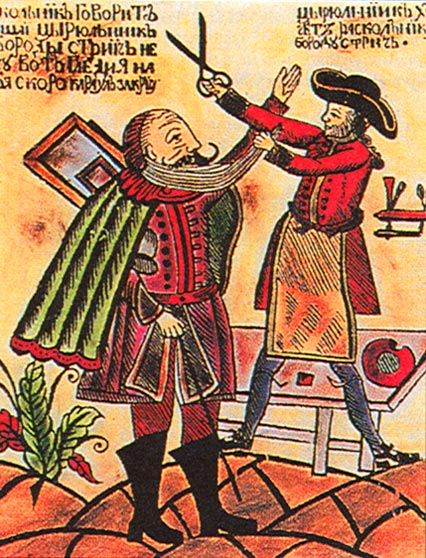 Н. В. Гоголь писал об этом времени: «Какая смешная смесь во времена Петра, когда Русь превратилась на время в цирюльню, битком набитую народом, один сам подставлял свою бороду, другому насильно брили...» Окладистая борода являлась по старой русской традиции и украшением человека, и признаком его мужественности, и символом принадлежности к православию. Поэтому насильственное бритье бород было расценено как притеснение и покушение на традиции. Тем не менее то ли из-за высокой платы, то ли из-за новой моды количество брадобритых постепенно возрастало. Со временем брадобритие вошло в привычку. Вошло в привычку также употребление пудры, помады, париков и шляп. Оно стало первым шагом на пути реформ быта и костюма.