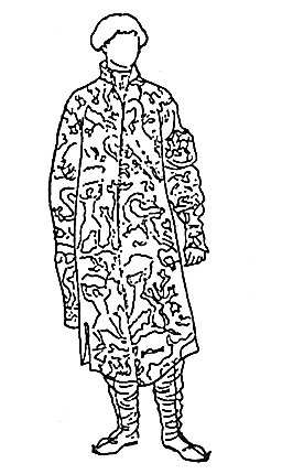 Шубы шили обязательно мехом внутрь и обыкновенно сверху покрывали сукном или шелком. По бокам разреза спереди пришивали нашивки, которые отличались от материи самой шубы. На них нашивали петли и пуговицы, а сам разрез окаймляли металлическим кружевом. Шубы обычно были в старину широкими распашными и длинными, с отложными воротниками. Турские (то есть турецкие) шубы отличались двойными рукавами — для рук и украшения. На исходе XVII в. появились еще шубы польские, без воротников, петлиц и пуговиц, они застегивались у шеи запонами и имели просторные рукава. Различали также шубы нарядные — для выходов и санные — для дороги. Санные шубы обыкновенно были нагольными, то есть не покрывались сверху материей. Вкусы того времени требовали ярких цветов — чем ярче, тем больше уважения. Черные и темные тона использовались лишь для траурных одежд. Любимыми цветами знати был червчатый (красно-фиолетовый), лазоревый (голубой), зеленый, желтый, шафранный, кирпичный, сливный (темно-синий).