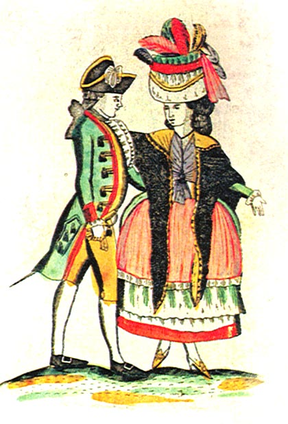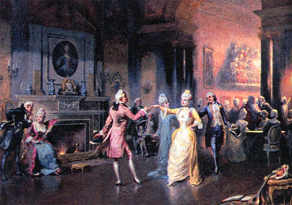 «Вообще наши тогдашние танцовщики, одетые по образцу придворных Людовика XIV, перенимали и в их обращении уловки сих корифеев светской жизни; но, подражая, старались иногда превосходить тех, которых брали за образец. Таким образом мужчина, желавший танцевать с дамою, подходил к ней не прежде, как после трех церемониальных поклонов, во время танцев едва касался пальцами ее пальцев, и когда оканчивал, тогда изъявлял свою благодарность, поцеловав ей руку. Гордая поступь в польском, важная осанка и узорчатыя па в менуэтах отличали хороших танцовщиков». |