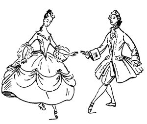 Менуэт, способствующий выправке корпуса, начинался с поцелуя руки дамы кавалером, который вставал на колено. Танец отличался мерностью и церемонностью движений, танцоры двигались мелкими и размеренными па с приседанием на правой ноге, стараясь придавать фигурам изящные позы. Исполняя мелкие движения с правой ноги, дамы подавали левую руку, с левой — правую. Шаги сменяли приседания. Все это происходило под монотонные звуки духовой музыки. Интересно, что менуэт стал в XVIII в. «белым танцем». Отказ кавалера танцевать с пригласившей его дамой означал для мужчины окончание танцев на этот вечер.