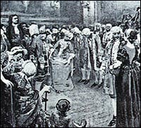 «Русская пляска, вместе с длинными кафтанами и сарафанами, осталась только в нижнем классе народа; заменили оную степенный польский, тихий менуэт и резвый английский контрданс... Кроме сказанных танцев был церемониальный, которым всегда начинались свадебные и вообще торжественные праздники: становились, как в экосез, при степенной музыке мужчина кланялся своей даме и потом ближайшему кавалеру, дама его следовала тому же примеру, и, сделав круг, оба возвращались на свое место. Шли поклоны, повторенные всеми, заключались польским; тогда маршал, заведовавший праздником, громко объявлял, что церемониальные танцы кончились...» |