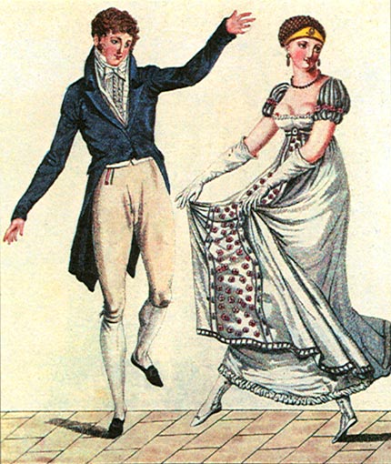 В конце XVIII в. узкие прозрачные платья изменили реверансы. Дамы не могли за них взяться и при легком приседании руки складывали ладонь в ладонь. Кавалер теперь делал ногой шаг в сторону и легкий поклон корпуса, затем вставал назад и корпус выпрямлял. Чем далее от начала бала, тем танцы становятся меньше похожими на придворный балет, все больше в нем свободы движений и танцевальной игры. Прощальным выступлением участников бала был котильон. Один из кавалеров являлся кондуктором, то