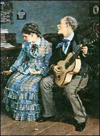 Грудь мужской рубашки почти сплошь закрывали галстуком с булавкой, а манжеты украшали золотыми и серебряными запонками. Черный узкий галстук завязывали небольшим бантом или плоским узлом. С летним костюмом галстук повязывали светлый, с вечерним фраком — накрахмаленный белый батистовый галстук, концы узла которого торчали в стороны.