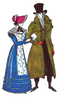 Костюм XIX в. противопоставлял мужчину, с его упрощенными формами и постепенно темнеющими красками, и женщину, которая стала в своем наряде мерилом состояния мужа и рекламой богатства семьи. В первые десятилетия XIX в. модным женским силуэтом были платья в стиле ампир. В. Верещагин писал о моде александровского времени: «Блестящим метеором промелькнула воздушная богиня начала XIX в. Приблизительно с 1806 г., в ущерб общей стильности наряда, женщины начали прикрывать свои чары. Исчезли легкие полупрозрачные ткани, утратилась их благородная простота».