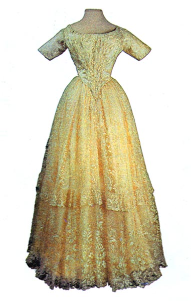 Рукава настолько были огромными, что их сажали на каркас из китового уса или крахмальную подкладку, так как их сильно мяла верхняя одежда. Широкие короткие рукава на очень узкой манжете называли пагода (от фр. Ala pagode). В 40-е гг. в моду вошел рукав с буфом от локтя до кисти руки, в связи с этим талию женского платья удлинили, а на юбках стали делать большое количество сборок. В этом случае также создавалось впечатление тонкой талии. В моду вошло декольте, прикрываемое кружевом золотисто-желтого цвета, называемое блондой. Н. В. Гоголь дал великолепные описания дамы того периода в повести «Невский проспект»: «Кажется, как будто целое море мотыльков поднялось вдруг со стеблей и волнуется блестящею тучею над черными жуками мужеского пола», «А какие вы встретите дамские рукава на Невском проспекте! Они несколько похожи на два воздухоплавательных шара, так что дама вдруг бы поднялась на воздух, если бы не поддерживал ее мужчина».
