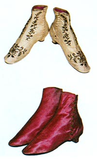 В 30-е гг. обувь была по-прежнему без каблуков, из атласа белого, розового и голубого цветов. Также обувь изготовляли из бархата и сукна. Материалом для изготовления обуви служила тонкая и плотная ткань саржевого переплетения — прюнель. Она была гибкой, прочной и достаточно ноской. Плоские открытые туфли на узкой подметке с квадратным носком держались на ноге с помощью завязок из того же материала. Для балов их расшивали золотом и серебром. К туфлям полагались шелковые белые чулки. Зимой носили невысокие ботинки из сукна или плиса на шнуровке или маленьких перламутровых пуговицах. Для их застегивания существовал специальный сапожный крючок. Теплые зимние ботинки оторачивали мехом. Башмаки и ботинки делали из фетра. С удлинением юбок в конце 30-х гг. появился средний, а затем и высокий каблук, а в конце 40-х гг. — обувь с лакированным носком. Башмачки могли быть сшиты из шелка или бархата, а носок и каблук непременно лакированные черные. До середины 40-х гг. носок женских туфель был острым, затем стал квадратным. Для балов использовали атласные и парчовые ботинки со шнуровкой на внешней стороне.