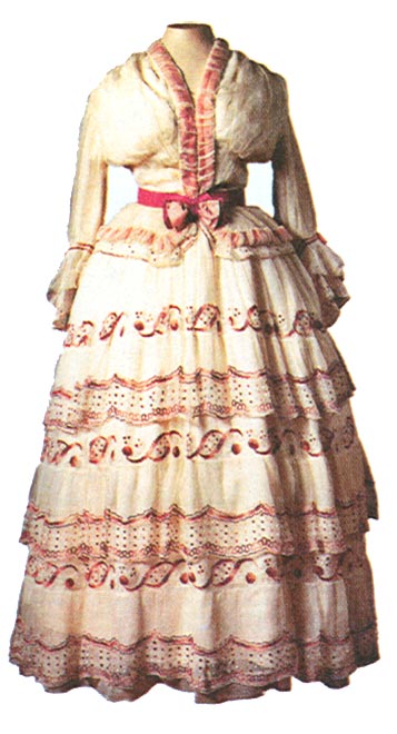 Женские юбки стали делать с кринолинами (от фр. crine — волос, lin — лен). В жесткую льняную ткань стали вшивать клетку из проволоки или конского волоса, как во все времена рококо. Юбка с кринолином имела несколько рядов воланов — от 3 до 16. Иногда платье состояло из нескольких юбок разной длины, причем в середине XIX в. выпускали купонные материи с узором разной величины. В конце 1860-х гг. на кринолине стали оставлять только нижние обручи, которые расширяли подол. Под верхнюю юбку надевали несколько жестко накрахмаленных нижних юбок. Лиф у платьев делали облегающим, круглым или мыском. В середине 60-х гг. женская мода в некотором смысле напоминала мужскую: спереди лиф с двумя мысками как мужской жилет, и сзади — баска, напоминающая фалды фрака. В 1860-е гг. окончательно утвердилась ретроспектива моды XVIII в. — платья со шлейфом, драпировки на бедрах и сзади.