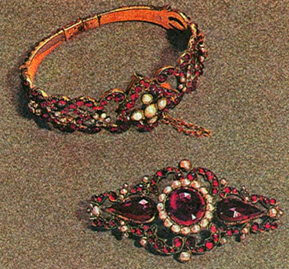 Модными считались украшения в русском стиле из цветных камней и эмали, с применением техники скани, а также отделки граненым стеклярусом. В русском стиле делали серьги, броши с подвесками, пряжки. В моде кольца с овальными или прямоугольными камнями в узкой оправе или в лапках, серьги с подвесками, серьги в виде двойного кольца с кораллами, бирюзой или жемчугом, бриллиантовые пряжки на бархотках. В украшениях была заметна тенденция к натуральным формам цветов, листьев, колосьев, пчел, мух, птиц.