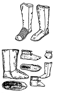 Сапоги носили до колен, и они служили защитой для ног, поэтому подкладывались мягкой холстиной. В старину сапоги были без каблука и имели мягкую в несколько слоев кожи подошву, заостренный носок. Позже появился каблук и сложили поговорку: «Из-под носка соловей пролети, а вокруг пяточки — яйцо кати». Каблуки прикрепляли железными или серебряными скобами, а подошвы — гвоздями. Иностранец С. Герберштейн писал: «Сапоги они носят красные и очень короткие, так что они не доходят до колен, а подошвы у них подбиты железными гвоздями». Спереди сапог был обыкновенно выше, чем сзади, швы располагались по бокам. Кроилась обувь на одну ногу, так как колодки, с помощью которых шилась обувь, не давали различий правого и левого сапога. Так и говорили: «Два сапога — пара, и оба на левую ногу». Поэтому новые сапоги долго разнашивали. Сапоги делали и черного, и зеленого, и желтого цветов, но чаще всего — красного. Края голенищ богатых сапог отделывали тесьмой, полосками яркой ткани, не говоря уже о вышивке: у самых знатных на сапогах можно было увидеть даже жемчуг.