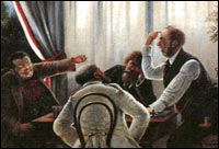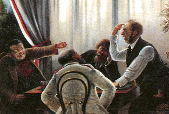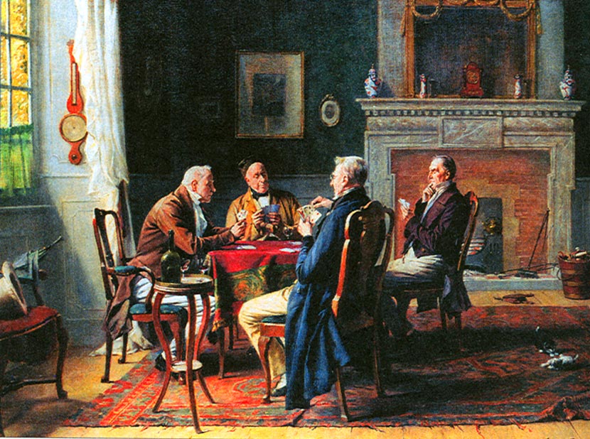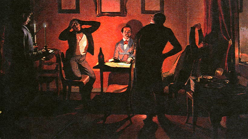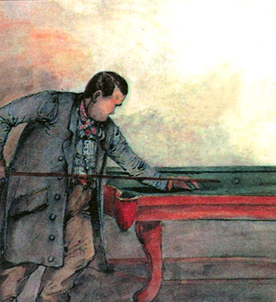 У прямоугольного стола, покрытого зеленым сукном, собрались игроки. Один человек раздавал карты, то есть метал банк, а другой записывал мелком на зеленом сукне количество денег, ставок и долгов. Начиналась игра в полном молчании. Она требовала выдержки, хладнокровия, сосредоточенности и достоинства. В этом смысле игра в карты была поединком, похожим на дуэль.