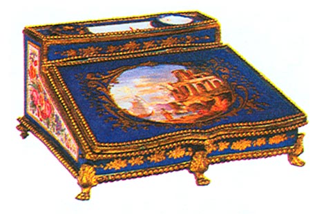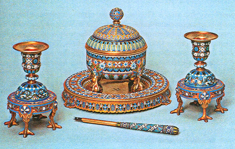 Письменный прибор: чернильница, подсвечники и ручка. 1880-е гг.