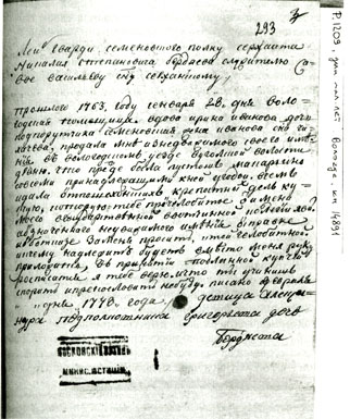 | Верующее письмо. Февраль 1778 г. Текст - рукою писца, подпись - автограф А. Г. Бердяевой РГАДА. Ф. 1209. Оп. 717. Кн. 14 891. Л. 293 - 293 об. |