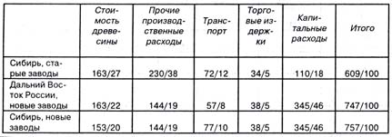 Наибольшую себестоимость производства беленой целлюлозы из хвойных пород имеет продукция, произведенная на новых заводах Сибири - 757 долл. за тонну, наименьшую - продукция, произведенная на старых заводах Сибири - 609 долл. за тонну.