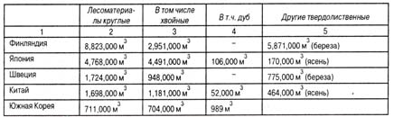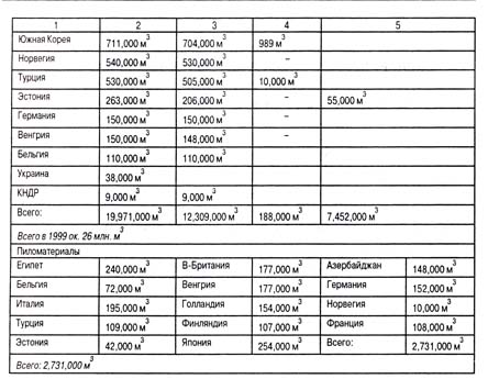 Негативным явлением в лесоэкспортном сотрудничестве со странами дальнего зарубежья является уменьшение поставок пиломатериалов и потеря рынков этого товара. В настоящее время экспорт пиломатериалов из регионов Карелии, Архангельской области, Красноярского края значительно сократился, и место России на рынках пиломатериалов успешно завоевывают Швеция, Финляндия, Канада и другие страны. Основными импортерами российских лесоматериалов к 1999 г. стали Финляндия (33,8%), Япония (22,2%) и Китай (15,9%), вытеснив традиционных европейских покупателей (таблица 6.16).