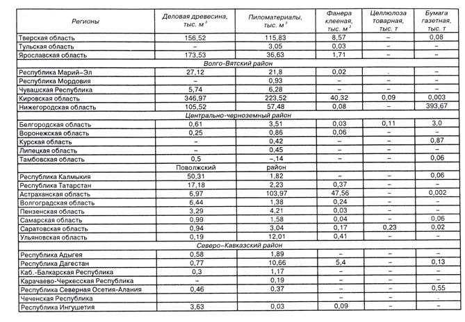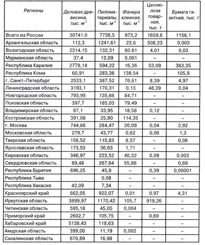 В страны дальнего зарубежья поставки круглого леса, фанеры, продукции целлюлозно-бумажной промышленности существенно возросли. Причем регионы России стараются максимально использовать и лесные ресурсы на их территории, и близость к мировым рынкам лесоматериалов. В таблице 6.19 даны оценки удельного веса (в %) некоторых регионов России во внешней и внутренней торговле древесиной в 1999 г., по данным Госкомстата и Таможенного комитета.