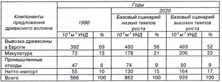 До 2020 г. основным элементом предложения в Европе сохранится вывозка древесины, и ее доля будет превышать 50%. Вторым по своей величине элементом предложения является сбор макулатуры, на долю которой, как ожидается, к 2020 г. будет приходиться более 20% предложения древесного волокна в Европе, по сравнению с 13% в 1990 г. Нетто-импорт, на который в 1990 г. приходилось приблизительно 10% предложения волокна, увеличится к 2020 г. до 15-17%. Относительная доля промышленных древесных отходов не изменится и сохранится на уровне приблизительно 10%.