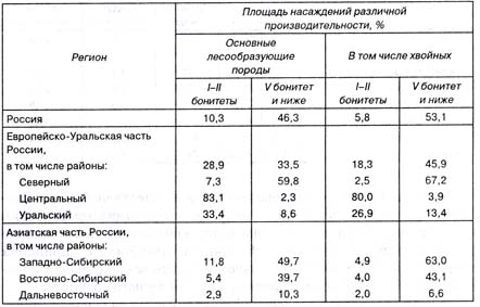 Классическое лесное хозяйство, предполагающее планирование пользования на оборот рубки, учитывающее различные виды спелости леса в зависимости от спроса, и т.д., требует учета имеющихся в наличии площадей производительных лесов, в первую очередь хвойных лесов. Согласно табл. 4.2, в которой представлено распределение площади лесов по их производительности в соответствии с классами бонитетов основных лесообразующих пород (в первую очередь, хвойных), в наиболее многолесных регионах России (Северном, Западно-Сибирском и Восточно-Сибирском экономических районах) произрастают наименее производительные леса (класс бонитета V и ниже составляют 40-60% площади эксплуатационных лесов). По всей России только 10,3% лесов с высшими классами бонитета по производительности, а площади лесов, где произрастают хвойные породы высших двух классов бонитета (I и II), составляют всего 5,8% площади земель, покрытых лесной растительностью. Более половины всех хвойных лесов России (53,1%) представлены V классом бонитета и ниже (высотой сосны 9-15 м в возрасте 100 лет).