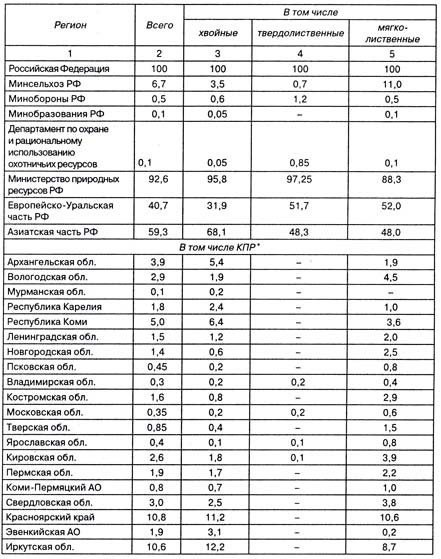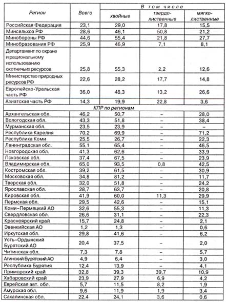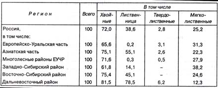 Леса, возможные для эксплуатации, на 72% представлены в России хвойными породами, из которых, в свою очередь, почти 30% приходится на лиственницу. В табл. 4.3 приведены данные о процентном распределении лесов, возможных для эксплуатации по хозяйственным секциям в пределах отдельных регионов России.