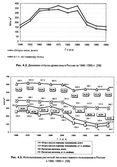 В Азиатской части России рост объемов отпуска древесины по главному пользованию продолжался до 1975 г., а в последующие 15 лет наблюдалась относительная стабилизация его на уровне 125-128 млн м3. С 1990 по 1993 гг. отпуск древесины по главному пользованию сократился на 38,5%. По рубкам промежуточного пользования и прочим рубкам наращивание объемов отпускаемой древесины происходило в Азиатской части России вплоть до 1990 г., когда они составили в общей сложности 20,4 млн м3. С 1990 по 1993 гг. отпуск древесины по главному пользованию сократился на 38,5%, а по промежуточному пользованию и прочим рубкам на 37,2% [126].