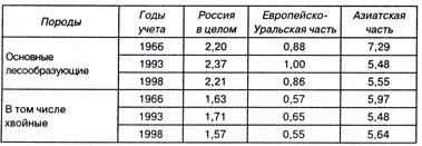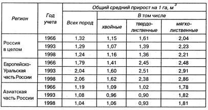Общий средний годичный прирост древесины в лесах составляет 892 млн м3 (Европейско-Уральская часть - 288 и Азиатская - 604 млн м3). Ежегодный средний прирост древесины основных лесообразующих пород на 1 га земель, покрытых лесной растительностью, равен 1,24 м3, при этом в Европейско-Уральской части - 2,06 м3, в Азиатской - 1,04 м3. Значения средних приростов на 1 га -достаточно постоянные величины, и без их знания невозможно вести лесное хозяйство. Прирост древесины целесообразно рассматривать с учетом естественного отпада, что возможно лишь на основе материалов натурных экспериментов [129]. Следует учитывать также, что прирост как таковой не вырубается, а при рубке леса берется часть запаса целиком, т.е. часть деревьев из всей массы на той территории, на которой ведется лесное хозяйство и планируется пользование лесом.
