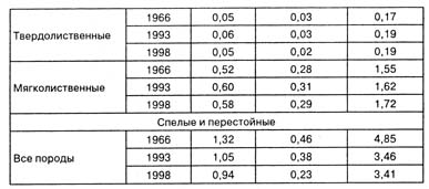 Изымаемый запас как расчетный показатель нельзя путать ни со средним, ни с текущим приростом, поскольку интенсивный прирост массы происходит в сохраняемой, не достигшей спелости части запаса, тогда как в вырубаемой части прирост ко времени назначения древостоя в рубку почти сравнивается с древесным отпадом. По массе и количеству древесины, начиная примерно со времени, когда древостой достигает спелости, запасы на 1 га древостоев, относимых к категории эксплутационного фонда, мало меняются. Изменения происходят в основном в товарной структуре насаждений [1, 60, 65]. В табл. 4.6 приведены оценки среднего прироста запасов древесины в государственном лесном фонде России в динамике по материалам трех государственных учетов лесного фонда.