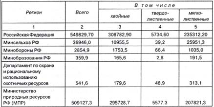 Основной объем главного пользования лесом (более 90% суммарной расчетной лесосеки по России) находится в ведении МПР России, что полностью соответствует его гигантским полномочиям. 6,2% суммарной расчетной лесосеки по главному пользованию приходится на Министерство сельского хозяйства РФ, причем по мягколиственному хозяйству на него приходится 11% ежегодного расчетного пользования, или 25,95 млн м3 ликвидной древесины. Фактическое же пользование мягколиственным хозяйством со стороны Минсельхоза составило 5,5 млн м3 ликвидной древесины в 2001 г.