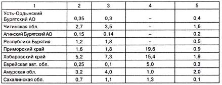 Низкое использование среднего прироста к 1997 г. (0,9-1,3 мi на 1 га) было отмечено в Дальневосточном, Северном, Восточно-Сибирском и Западно-Сибирском районах страны (рис. 4.5).