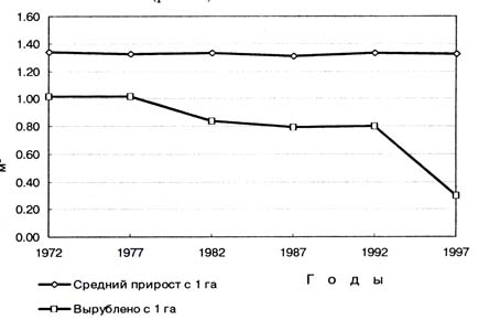По некоторым оценкам [29], в России ежегодно вырубается объем древесины, составляющий 0,14% от общего запаса, или 13,3% от общего годичного прироста древесины. При этом, по тем же оценкам, интенсивность использования лесных ресурсов азиатской части России составила, например, в 1998 г. - 9,7% по использованию расчетной лесосеки и 7,5% по использованию годичного прироста древесины, при среднем запасе древесины 136 м3/га вырубалось в год только 0, 07 м3/га, но снижение использования среднего прироста началось в 1977 г. (рис. 4.4).