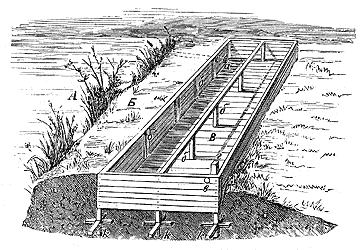 Толковую мочку тресты можно производить только в таком мочиле, которую можно содержать в надлежащей чистоте. Подобного рода мочила строятся следующим образом: выкопав четырехугольную яму, вкапывают по ее краям столбы б,б,б, поверх столбов делают обвязку из