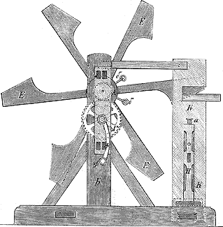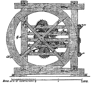 На шипах коренного вала 1 надеты деревянные маховые колеса; их поперечник 3 аршина, толщина венцов 3 1/2, а ширина 5 вершков. Обод каждого колеса соединяется с осью вращения посредством крестовины, образующей четыре спицы. На ось того же вала 1, за правым маховым колесом, надет шкив гг, имеющий в поперечнике 14 вершков.