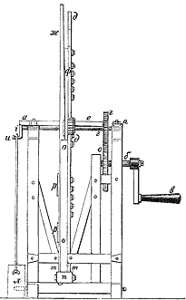 Для облегчения вставки и вынимания валов, подушек и пруг сделаны в стойках СС' вырезы, которые закрываются наставками ФФ' прикладываемыми к стойкам станка и удерживаемыми хомутиками II', сделанными из листового железа. Нижние хомутики II' прикреплены к стойкам гвоздями наглухо, верхние же I' прибиты к верхней части стойки только одним гвоздем в каждом конце, так что хомутик можно поворачивать, немного поднимая и спуская при отнимании или прикладывании наставки, концы которой ФФ' ради этого обделаны конусно. Рукоятки рр' расположены на маховых колесах ММ', так что находятся в прямо противоположных направлениях, каждая из них насажена на железный черен, одна половина которого оканчивается винтовою нарезкою с гайкою о, служащею для удержания рукояти; другою же плоскою половиною Я или Я', согнутою под прямым углом, прикрепляется двумя болтами о'о" к крестовине махового колеса и служит местом скрепления оного с осью вала Г. Лоток Т, выдолбленный из ольхового дерева, помещается сзади валов. Внутренняя и наружная его кривизна представляет собою дуги, начерченные из X и X'.