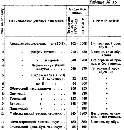 Параллельно с открытием высшего учебного заведения в широких размерах идет организация средних школ и школ пониженного типа. Создается целая сеть лесных техникумов, рабфаков, ФЗУ, леспромхозучей, курсов. Ниже приводим план учебных заведений с указанием контингента учащихся на 1931 год (табл. № 29).