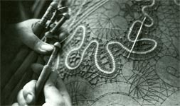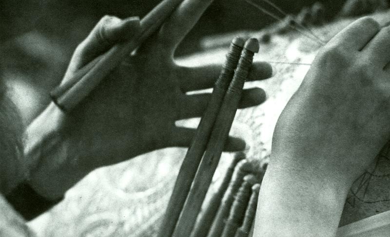 Когда это искусство возникло на вологодской земле и почему именно здесь получило такое широкое развитие, - на эти вопросы пока трудно ответить с определенностью. Возможно, какое-то значение имели местное льноводство и торговые пути, которые проходили здесь с севера на юг и приносили влияния иноземной моды, обретавшей на русской почве свои национальные формы. Слово «кружево» означает «окружать», украшать нарядной отделкой края одежды и других предметов из тканей. Кружевоплетение, как один из видов рукоделия, было известно на Руси издавна. Им, подобно вышиванию, занимались женщины всех сословий. Но если платье царей, князей и бояр украшало кружево из золотных, серебряных и шелковых нитей, то в народной одежде использовалось кружево из льняной пряжи, а с конца XIX века — из хлопчатобумажных нитей. Для плетения кружева используется подушка-валик, туго набитый сеном или соломой, пяльца - деревянная подставка-козлы, на которую кладут подушку; коклюшки-палочки, точеные из разных пород дерева, - на их концы наматываются нити для плетения. Быстро перебрасывая коклюшки в определенном порядке, кружевница выплетает нужный узор. На подушке для этого укрепляется «сколок» — рисунок на бумаге с отмеченными точками местами вкалывания булавок, которые создают как бы канву будущего узора и удерживают при переплетении его основные нити. В кружевоплетении существует несколько разновидностей, из которых Вологда славилась главным образом парной и сцепной техникой. Парную выполняют множеством (иногда до 200) пар коклюшек и применяют при создании мерных кружев -прошивок и краев для отделки тканей. В сцепной технике плетут штучные изделия: накидки, скатерти, покрывала, пелерины и др. Их выплетают по частям, которые потом соединяют небольшими «сцепами» с помощью вязального крючка. Однако в создании любого кружевного изделия участвуют обязательные четыре элемента: тесьма-полотнянка (по-вологодски «вилюшка»), сетка-решетка, плотная овальная или квадратная насновка и шнурочек-плетешок. Все множество кружевных узоров строится на вариациях рисунка и сочетаний этих элементов.