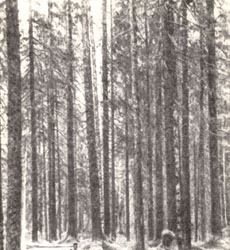 Рис. 21 . Северный еловый одновозрастный лес-черничник. Возраст — 180 лет, средняя высота — 20 м, средний диаметр — 24 см, запас — 200 м3. Виноградовский лесхоз, Архангельской области. Фото О. А. Неволина.