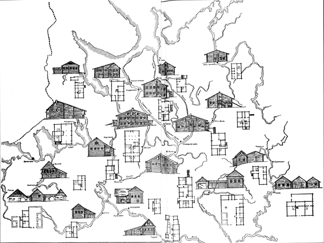 На карте – северные области европейской части России, и на фоне этих областей изображены бытовавшие там основные типы народного жилища. Просто нарисованы маленькие домики и рядом их планы – нижегородские, вятские, вологодские, волховские, кондопожские, архангельские, псковские, пинежские, костромские. Всего девятнадцать домиков, девятнадцать крошечных и поразительно разных рисованных избушек. Даже и не верится, что на такой сравнительно невеликой территории они столь разные. Но старые избы там везде и поныне такие же; все, кто знает сии края, подтвердят это.