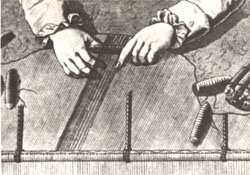 | Прокладка утка на участке узора при выработке гобелена на станке басслисс | Прибой утка на станке басслисс |