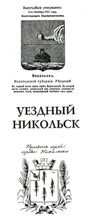 «Никольск. До учреждения городом именовалось сие место погостом Никольской Слободки. Положение имеет по правую сторону реки Юга, и по обе стороны двух оврагов; в округе онаго незаселенной пашенной сенокосной и лесной выгонной земли 2484 десятины 361 сажень, заселенной и вновь по прожекту градскою чертою объемлется 107 десятин 1325 сажен. Разстоянием от Губернскаго Города Вологды 632 от областнаго Устюга 162 версты. Во оном разнаго звания жителей 304. Казеннаго строения: 1-е. Не большой деревянной корпус присудственных мест построен в 1780-м году. 2-е. Соляной деревянной могазеин на каменном фундаменте построен в 1785-м году и при нем караульная изба построена в 1787-м году. 3-е. Деревянная кладовая для хранения денежной казны. Церковь каменная построена коштом обывателей одна. Домов по плану построенных 11-ть стараго строения, 20 анбаров, 176-ть для складки товаров, свозимых на пристань.