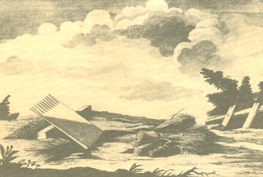 нижний конец, продергивают [Сие называется у них броснуть или бросать, а доска на то употребляемая слывет броснуха и бросальница, которой изображение представляет таблица VI. (См. рис. 18.)] лен несколько раз между зубами; таким образом сбивают с него головки, которые сбирают в мешки и сушат в своих избах; потом толкут их пестами в ступах и, истолокши, веют на гумнах для отделения семени от мякины. Обитый лен мочат в воде, в которой держат его по две и по три недели,